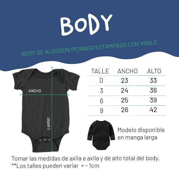 - Para saber el talle recomendamos medir en una superficie plana, un body para la edad buscada. De axila a axila y de alto total. Comparar con nuestra tabla y elegir en el menú desplegable.